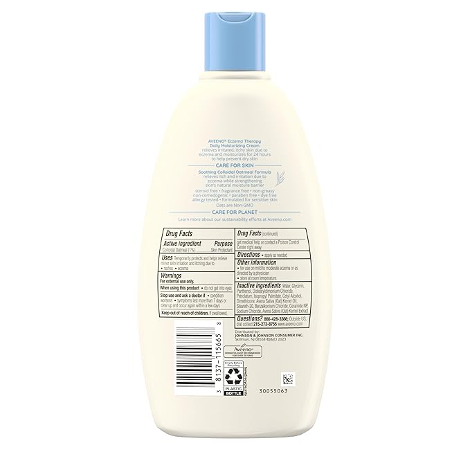 - 12 oz tube of Aveeno Eczema Therapy Daily Moisturizing Body Cream from the #1 dermatologist-recommended eczema moisturizer brand. Enriched with colloidal oatmeal & ceramide, it is clinically-proven to relieve dry, itchy, irritated skin due to eczema