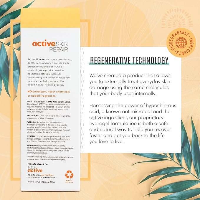- FIRST AID HYPOCHLORUS ACID HYDROGEL: The technology used in Active Skin Repair is the same safe and gentle molecule used in hospitals & households worldwide; Hypochlorus Acid cleanse wounds to help skin recover faster