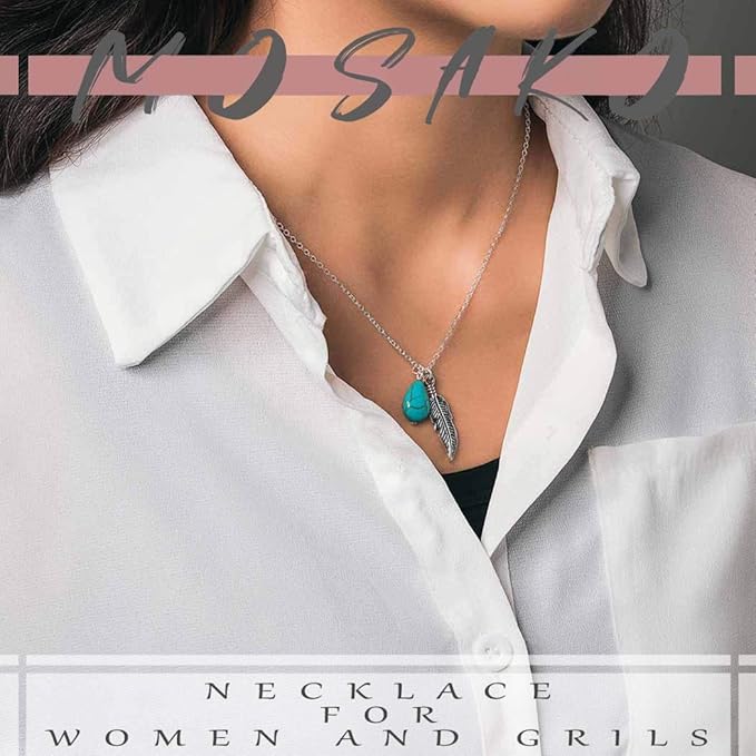 Boho Turquoise Necklaces Silver Feather Pendant Necklace Chain Short Delicate Dainty Necklaces Jewelry for Women
