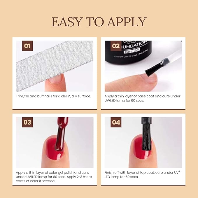 - Easy Application and Good Tenacity: The bare collection gel nail polish set is long-lasting for 28+ days with perfect shine under proper application - With base gel top coat under the full application Process. Please read the Products Description for more details. This item is UV gel. It is still sticky after curing. It must be used with a base coat and top coat! This item does not include base&top coat, which needs to be purchased separately.