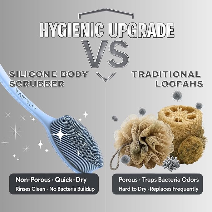 Avilana Silicone Body Scrubber – Gentle Shower Brush & Loofah Alternative- Food Grade & Lab Tested – Fast-Drying, Hygienic, BPA-Free Silicone Body Gentle Exfoliator (Blue, Long Handle)