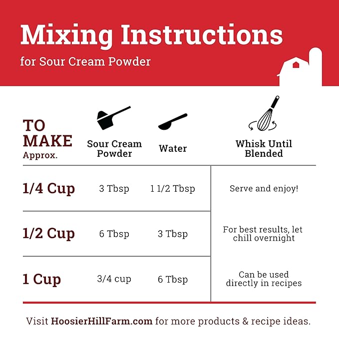 - To reconstitute into sour cream: mix 3 parts water with 5 parts Sour Cream Powder
