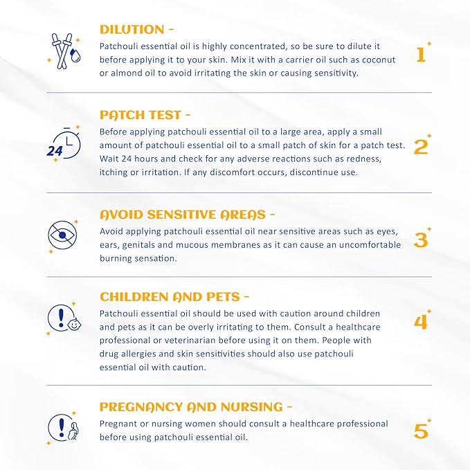 - Multiple Blend: Patchouli essential oil can be blended with Juniper Berry, Bergamot, Black Pepper, Ginger, Sage, Rose, Myrrh, Lemongrass, Frankincense, Pine, Sandalwood, Geranium, Lavender, Ylang-Ylang essential oils. Dilute with carrier oil before use. Test on feet first for skin sensitivity prior to widespread use