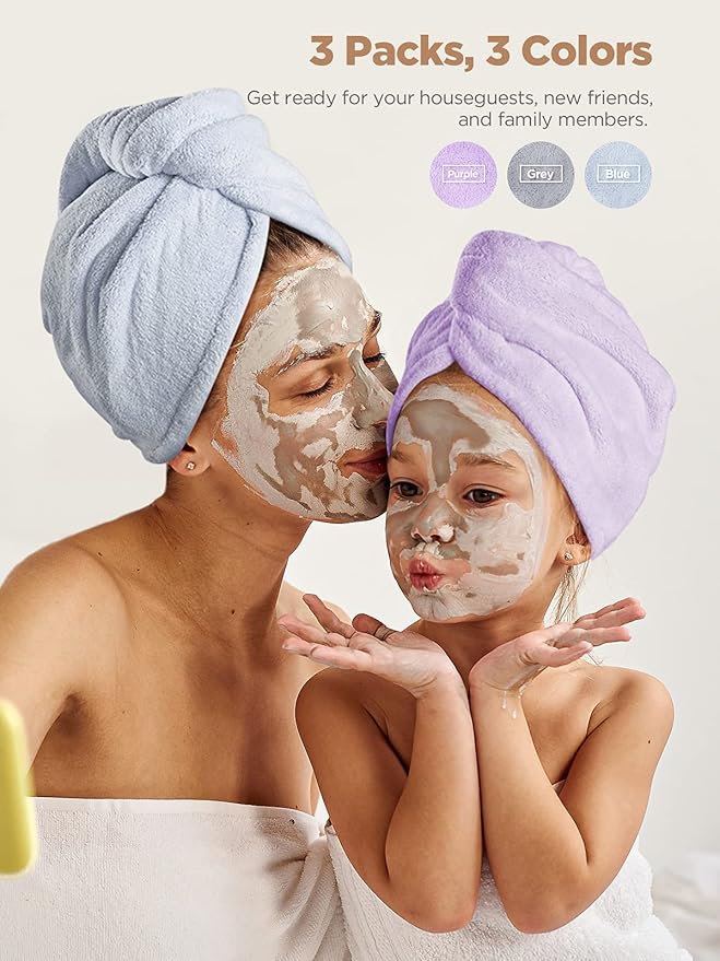 Hicober Microfiber Hair Towel, 3 Packs Hair Turbans for Wet Hair, Drying Hair Wrap Towels for Curly Hair Women Anti Frizz(Purple, Blue, Grey)