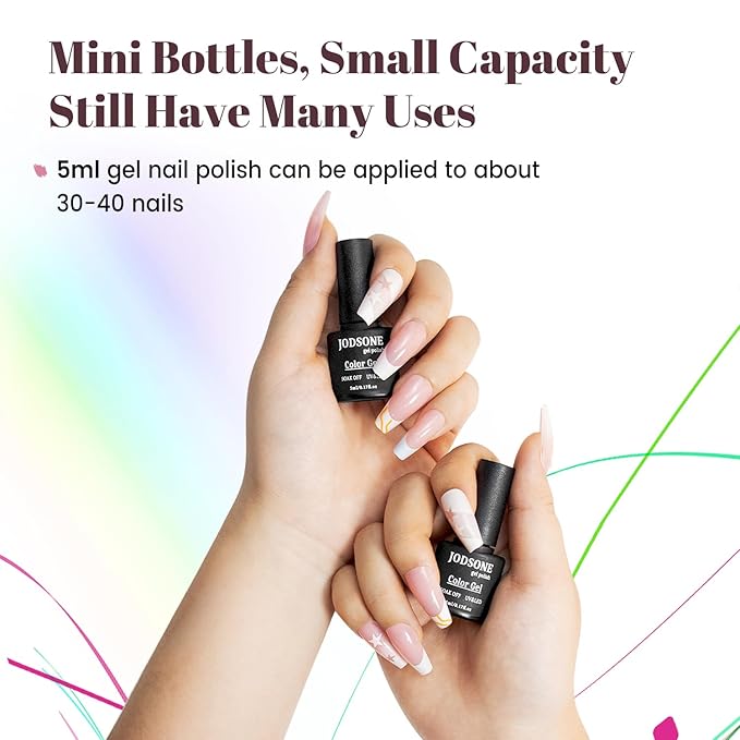 - What You Get: JODSONE 32 Colors Gel Polish (5ml each bottle) and 4 x No Wipe Base and Glossy & Matte,Glitter Top Coat. 32 classic and fashionable colors, suitable for all seasons and daily life! Owning the JODSONE 32 colors gel nail polish kit will make you addicted to the fun of nail DIY.