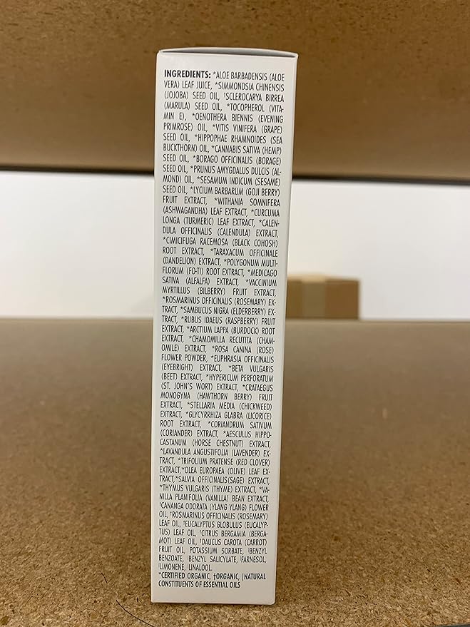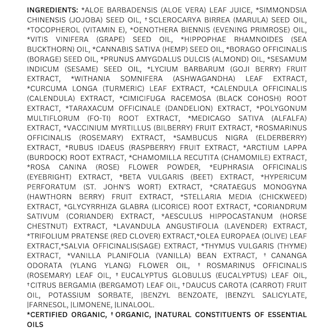 - Active Ingredients : *Aloe Vera Leaf Juice, *Jojoba Oil, †Marula Oil, *Vitamin E, *Evening Primrose Oil, *Grape Seed Oil,*Sea Buckthorn Oil, *Hemp Seed Oil, *Borage Seed Oil, *Almond Oil, *Sesame Oil, *Goji Berry, *Ashwagandha, *Turmeric, *Calendula, *Black Cohosh, *Dandelion, *Fo-Ti Root, *Alfalfa, *Bilberry, *Rosemary, *Elderberry, *Raspberry Leaf, *Burdock, *Chamomile, *Rose Hips, *Eyebright, *Beetroot, *St. John’s Wort, * Hawthorne Berry, *Chickweed, *Licorice, *Coriander, *Horse Chestnut, *Lavender, *Red Clover, *Olive Leaf, *Sage, *Thyme, *Vanilla Extract, †YlangYlang Essential Oil, †Rosemary Essential Oil, †Eucalyptus Essential Oil, †Bergamot (FCF) Essential Oil, †Carrot Essential Seed Oil, Potassium Sorbate *Aloe Vera Leaf Juice, *Jojoba Oil, †Marula Oil, *Vitamin E, *Evening Primrose Oil, *Grape Seed Oil,*Sea Buckthorn Oil, *Hemp Seed Oil, *Borage Seed Oil, *Almond Oil, *Sesame Oil, *Goji Berry, *Ashwagandha, *Turmeric, *Calendul… See more