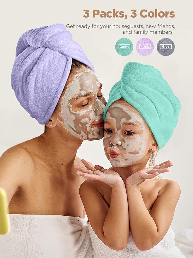 Hicober Microfiber Towel, Turbans for Wet Hair, Drying Wrap Towels for Curly Hair Women Towel Wrap for Kids-Purple,Green,Grey-Pack of 3