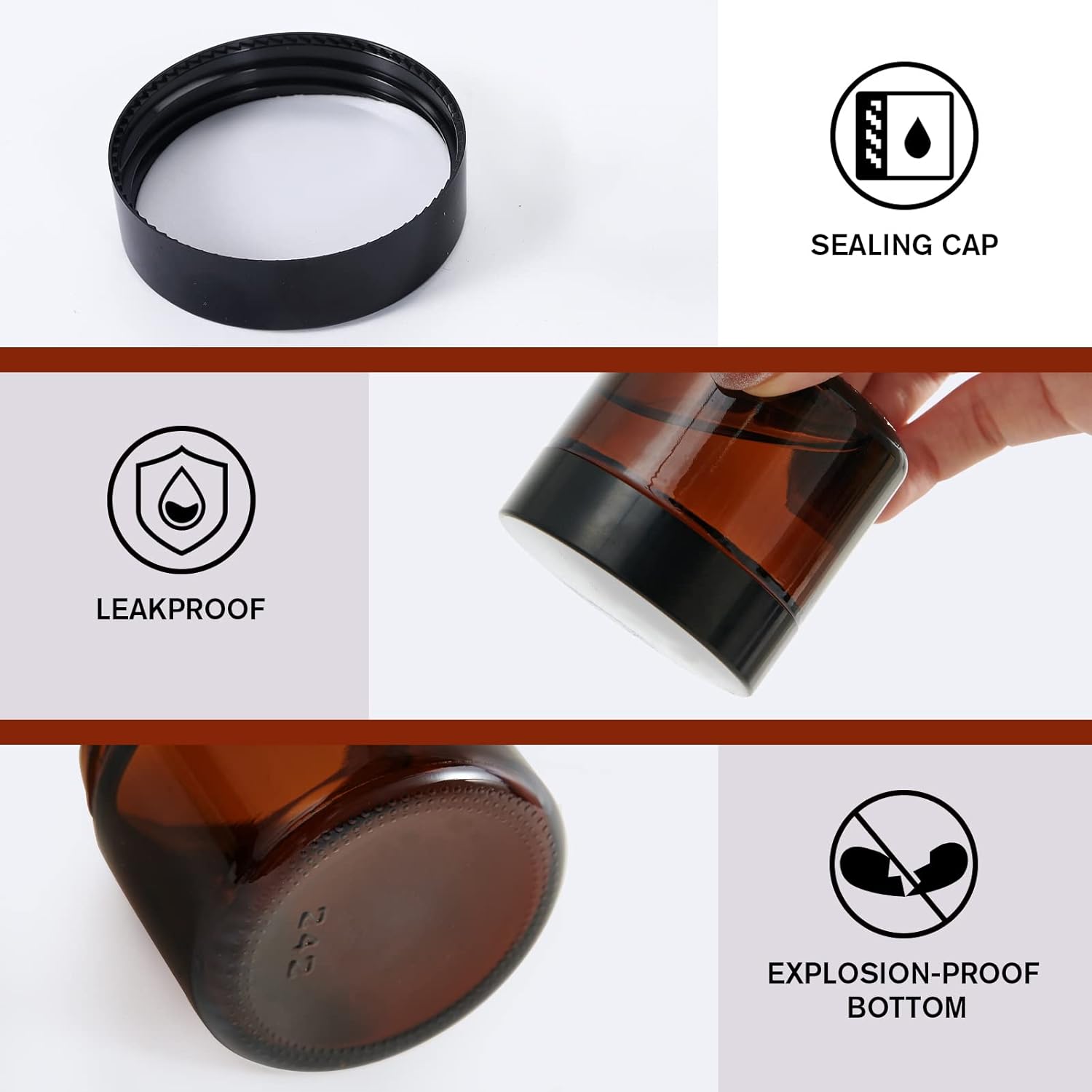 - Airtight Leak Proof: Don't worry about getting your cosmetic bag wet! The amber glass jars came with an Inner liner and the glass jars' tight thread fits perfectly with the glass bottle cap to protect the lotion and essential oil from leaking. Our empty airtight glass jars can be reused to reduce waste