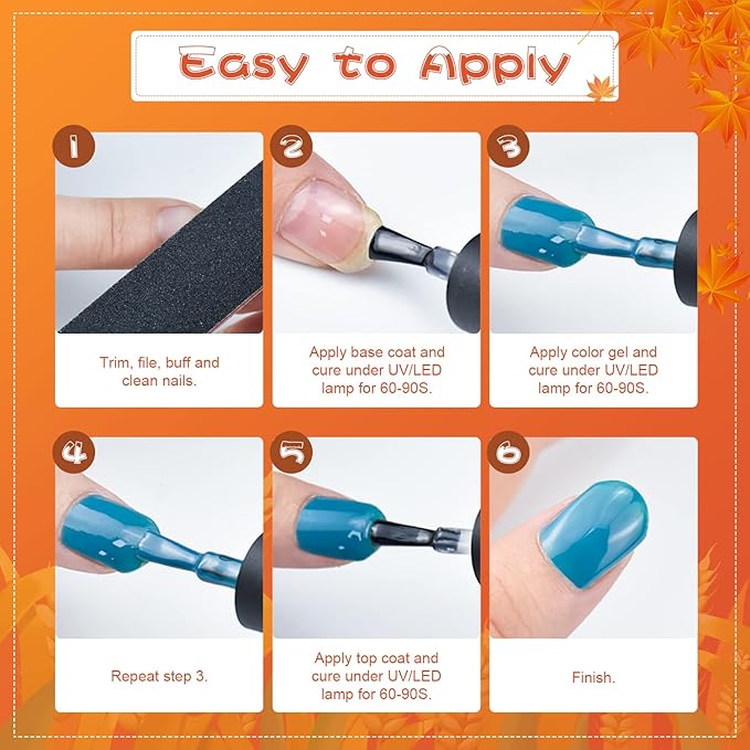 - Long-lasting and Healthy: The gel nail polish material is made of healthy ingredients, professional formula, and natural resin material. Under the curing and the right steps, it can be applied smoothly and lasts about 3 weeks.