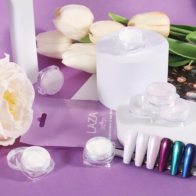 Laza White Pearl Chrome Nail Powder, 8 Colors Metallic Mirror Effect Pigment, Ice Transparent Aurora Nail Glitter Dust Kit for Gel Nail Art Decoration, Resin Craft, Gifts - Colorful White
