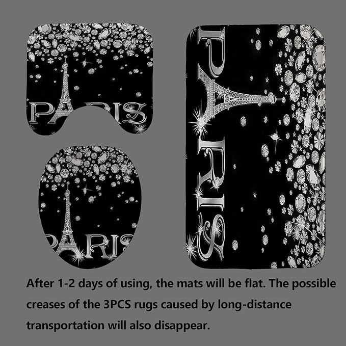 4PCS Eiffel Tower Shower Curtain Set, Luxury Jewelry Rhinestone Bling Diamond Paris Bathroom Decor, Waterproof Fabric Black Shower Curtain, Non-slip Bath Mat Toilet Lid Cover Bathroom Rugs