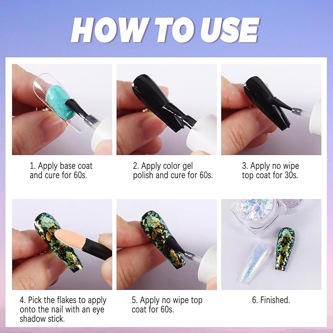 - Easy to Use: Be it, beginners or professionals can be easily used for the best effect. Just apply a small number of nail flakes to make a manicure. Apply with a sponge stick over a semi-dry topcoat, and cure for about the 30s to get perfect nail art.