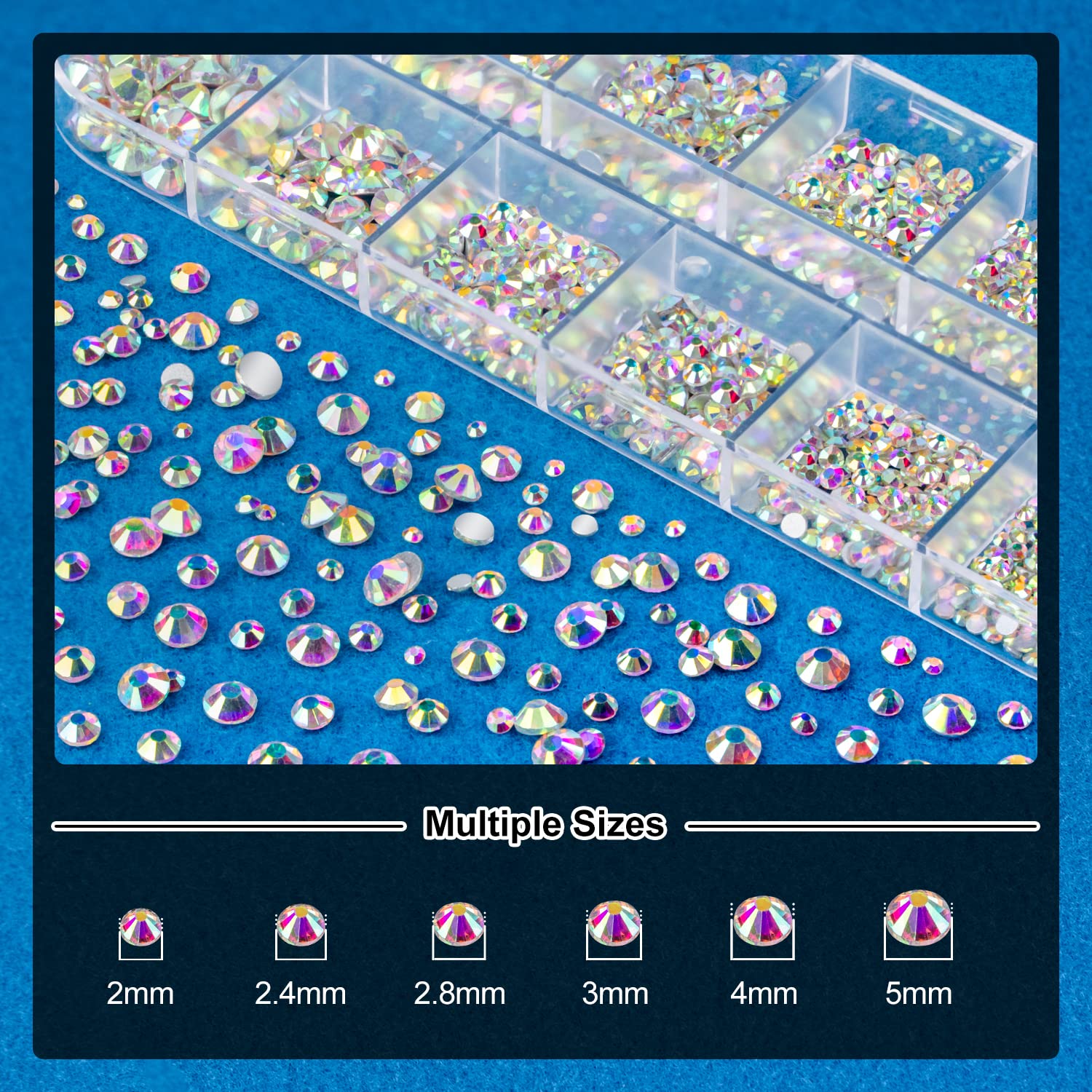 - MULTI-SIZE RHINESTONES: This flat back round glass AB rhinestones set includes 6 sizes (1.5mm, 2mm, 2.5mm, 3mm, 4.5mm, 6mm)—great for nail art design!