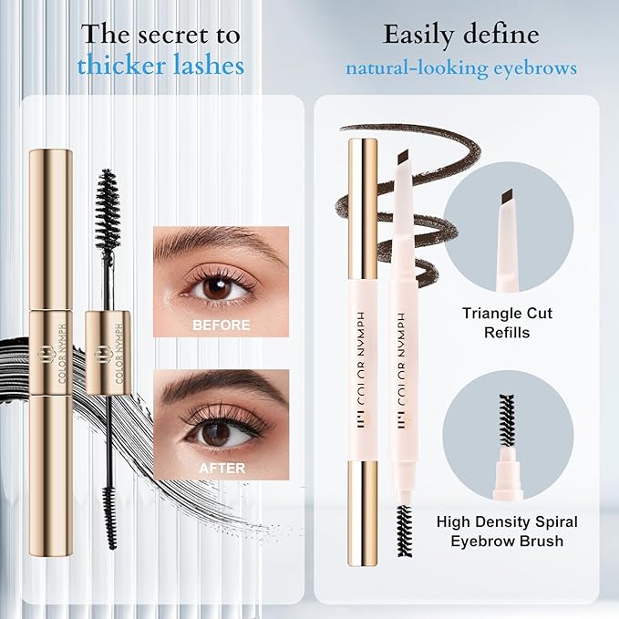 - 【All In One Makeup Kits】: Included 2 Pcs Lip Gloss, 2 Pcs Cream Eyeshadow Pen, 1 Pcs Dual-Sided Mascara, 1 Pcs Eyebrow Pencil, 1 Pcs Eyeliner Pencil, 1 Pcs Brush & Contouring Stick, 1 Pcs Shimmer Stick.