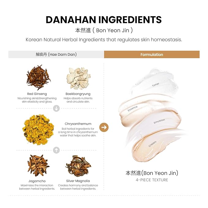 - Danahan Bon Yeon Jin is made with a powerful skin-rejuvenating formula of high-quality Red Ginseng and natural Korean natural herbal medicine to hydrate, nourish, and visibly rejuvenate skin.