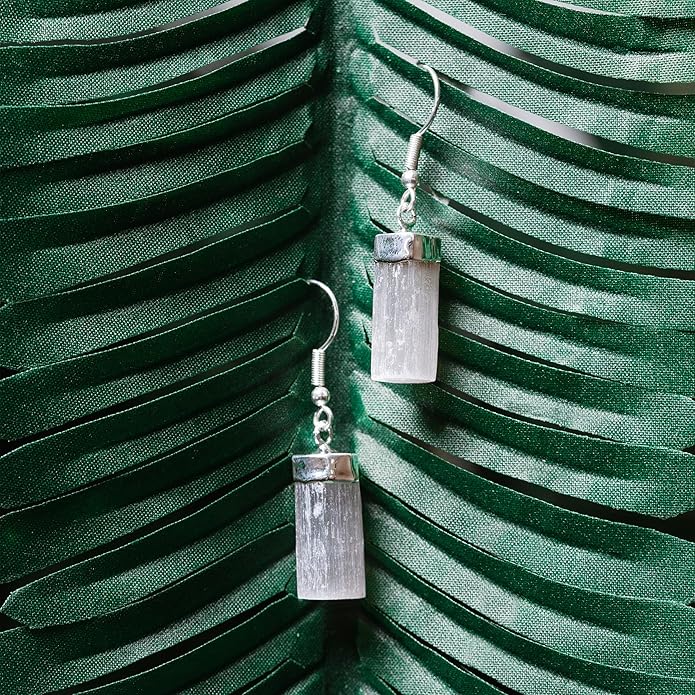 - SELENITE EARRINGS: Embrace clarity with these elegant earrings, featuring pure Selenite. Known for crown chakra alignment and favored by Taurus & Cancer zodiacs, it's a stone of tranquility.