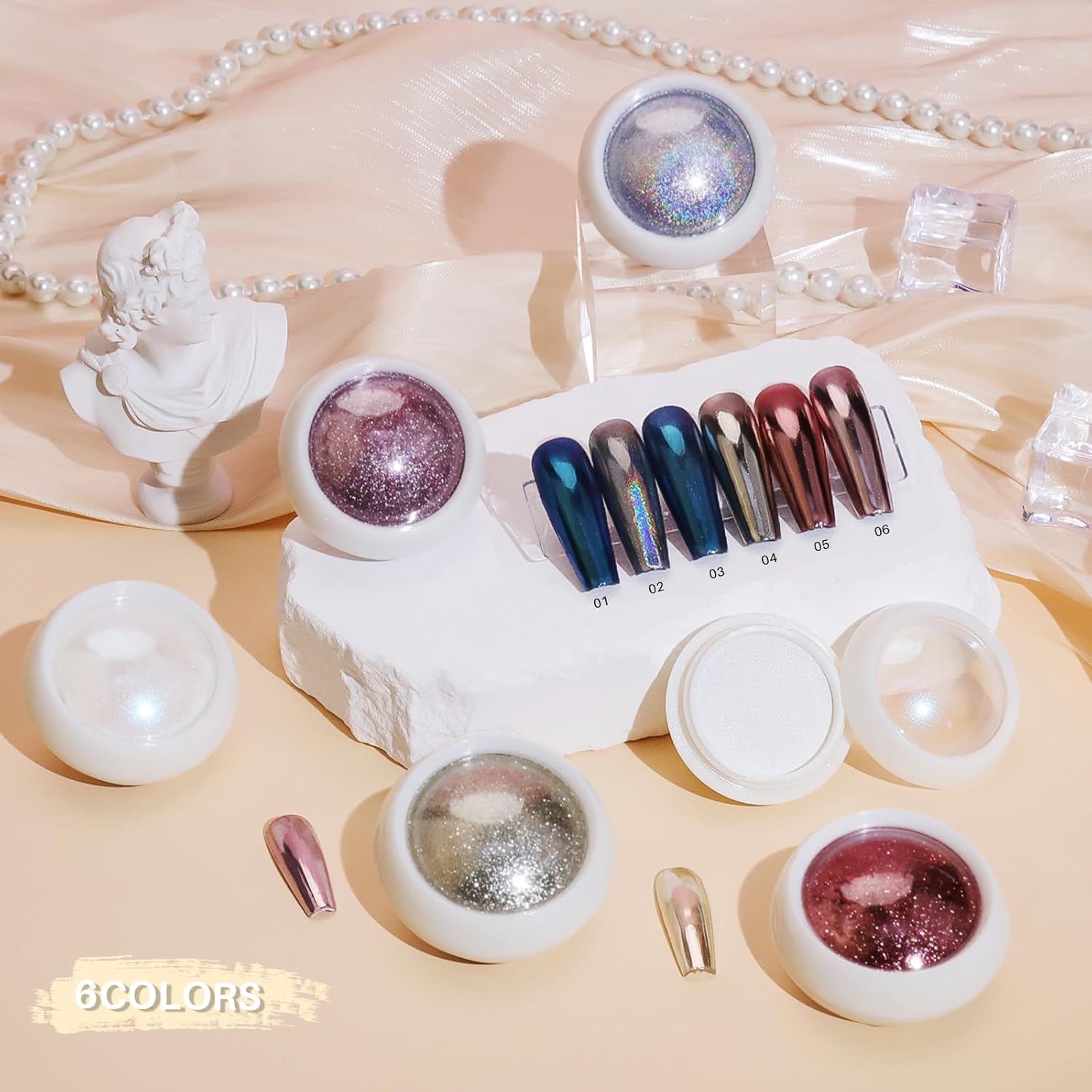 6 Pcs White Chrome Powder, Pearl Effect Nail Powder Shell Nail Glitter Dust Nail Powder with Magic Mirror Effect for Nail Art Design Decoration