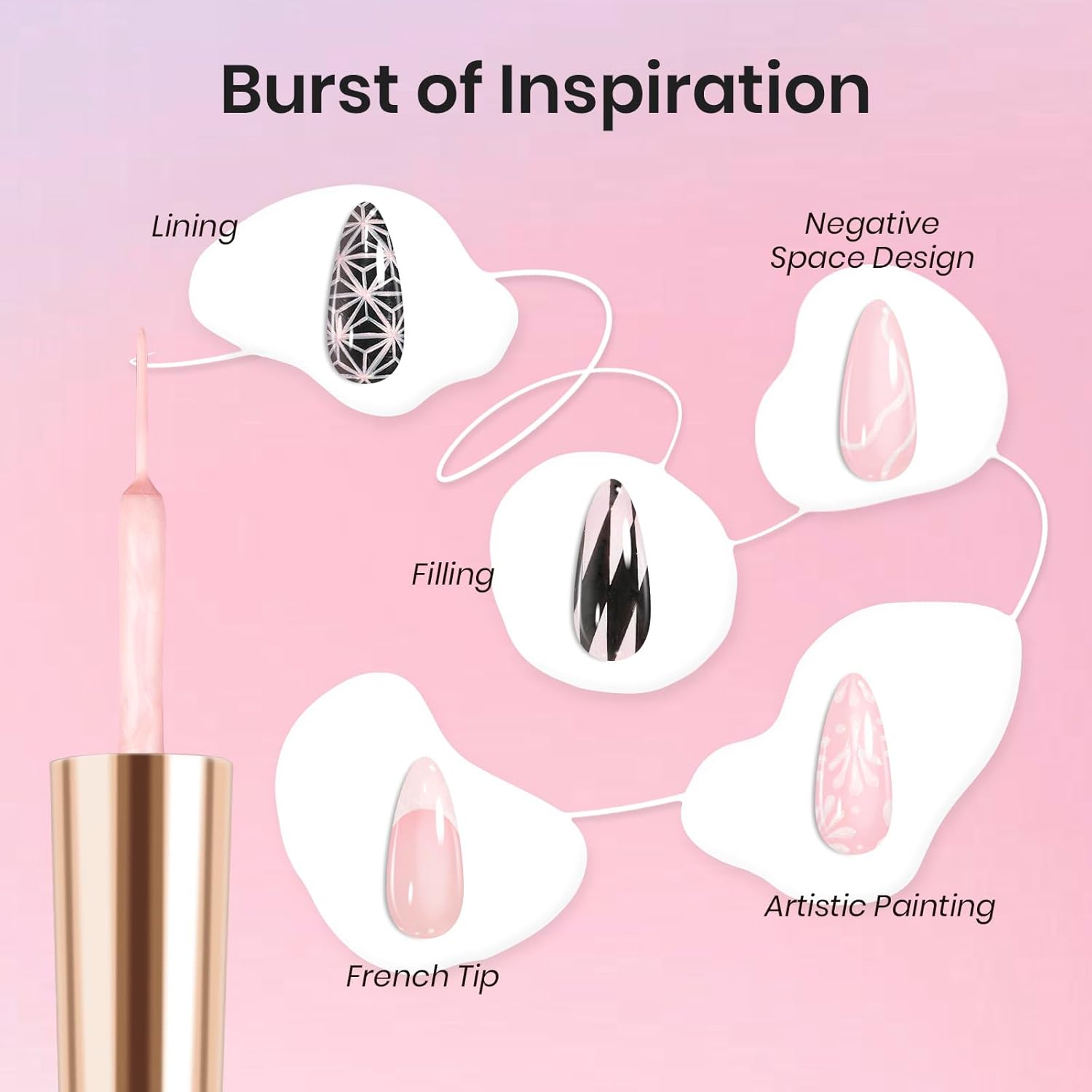 - Drawing Gel Nail Polish:Equipped with a Dotting Pen and Nail Charms, gel liner nail polish can help you to easily create mesmerizing swirls and intricate designs, making it perfect for both beginners and experienced nail artists looking to explore their creativity