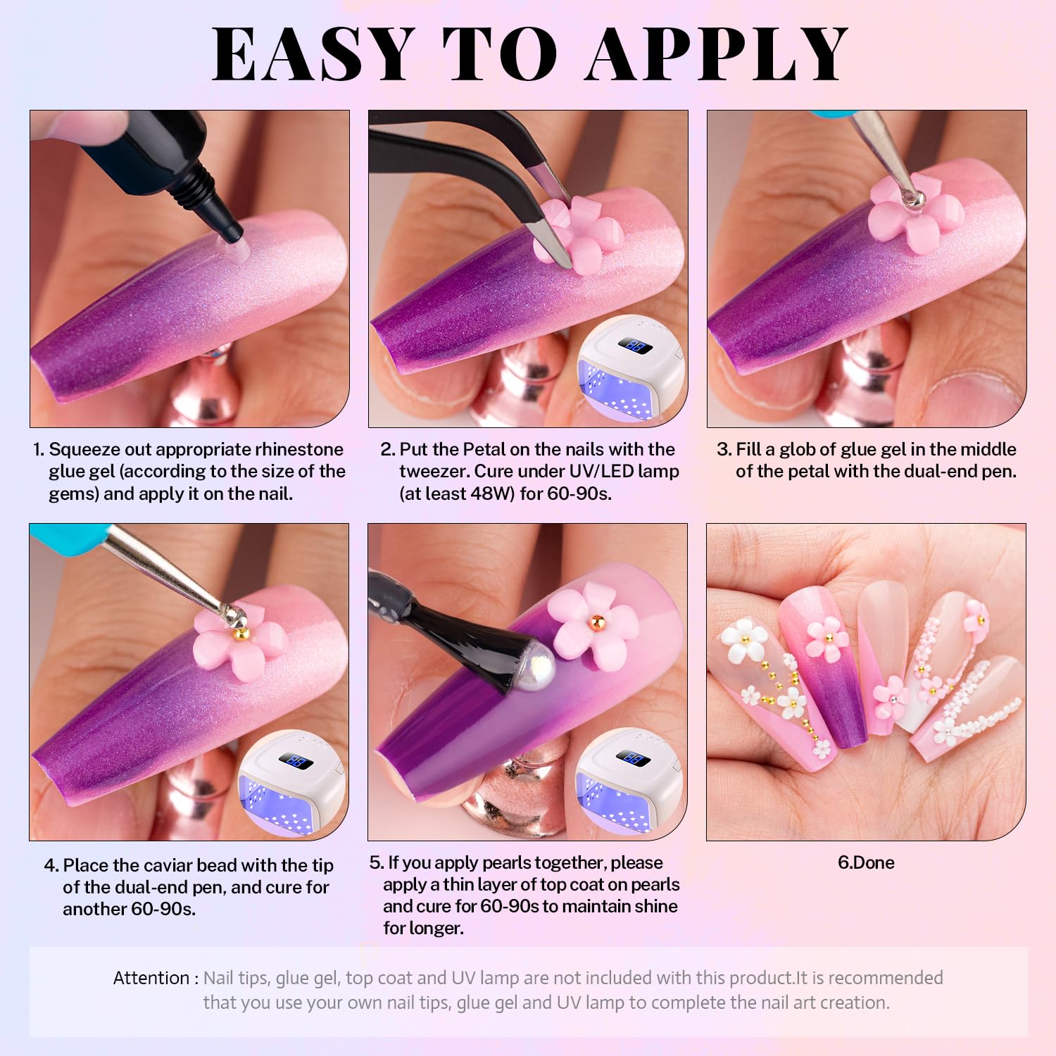 - šRHINESTONE DOTTING PICKER TOOLS -- The wide-head brush end of the dual-end dotting tool makes it easy to apply a large amount of glue to the nail surface at once, while the other mini dotting end is great for detailed drawing. Picker pen can help you handily pick up small flowers and metal beads, while tweezer is a better choice for big flowers and charms. The craftbeads are not self-adhesive and glue-needed. (Glue is not included.)