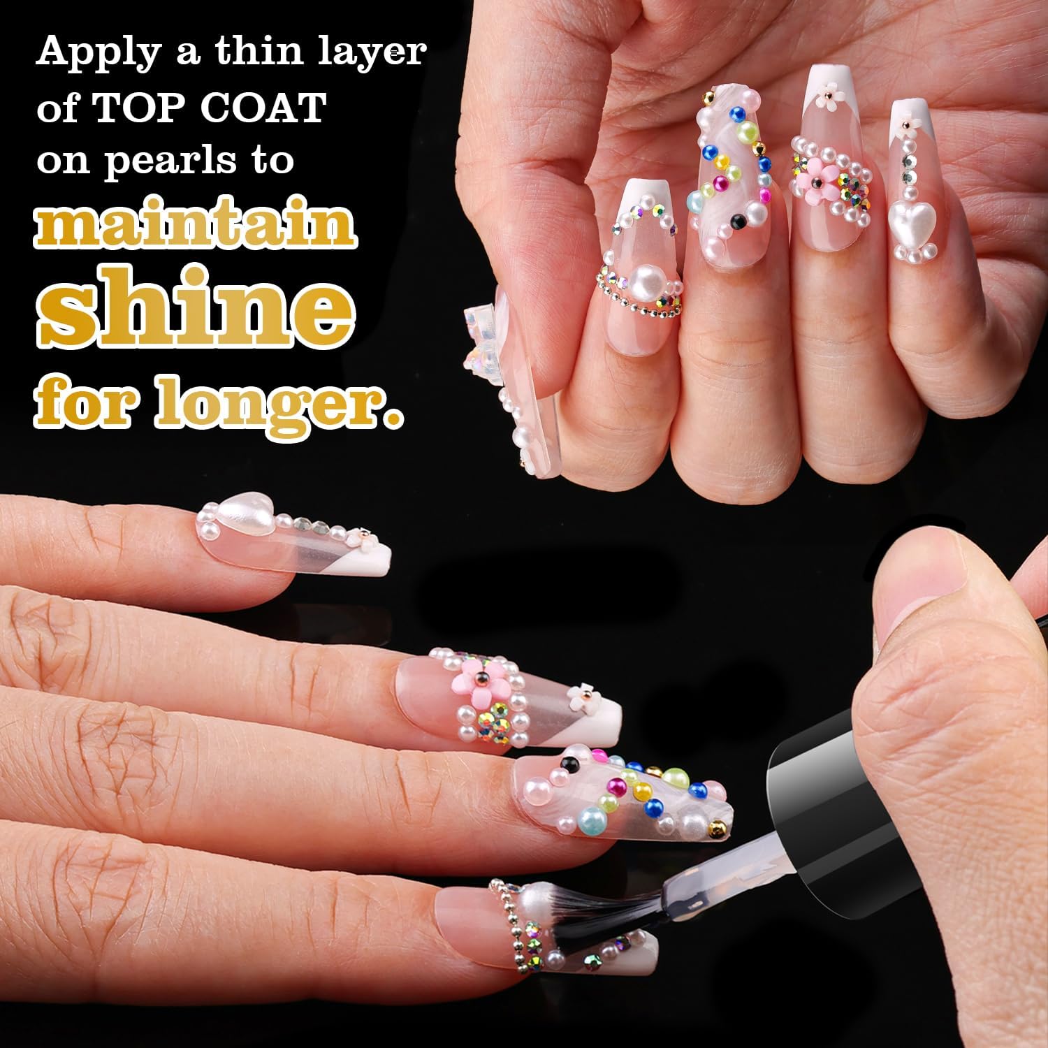 - 💎CHARMING COLORS & DISTINCTIVE EXTERIOR -- The clear color diamonds are luxurious and versatile that can be applied to multiple scenes. The AB color nail jewels can reflect bright light with iridescent glamour. All the nail crystals are featured with exquisite shapes and cutting facets. Our half-round pearl beads in colors of white and beige are smooth and glossy. We suggest applying a top coat over the pearls after completing your nail art to better maintain the pearls' luster and color.