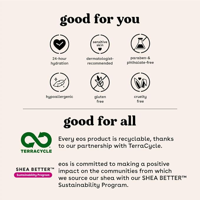 - MADE WITH SUSTAINABLE SHEA: Shea is a sustainable, renewable natural resource and through our Shea Better Sustainability program, eos is committed to making a positive impact on the communities from which we source our shea.