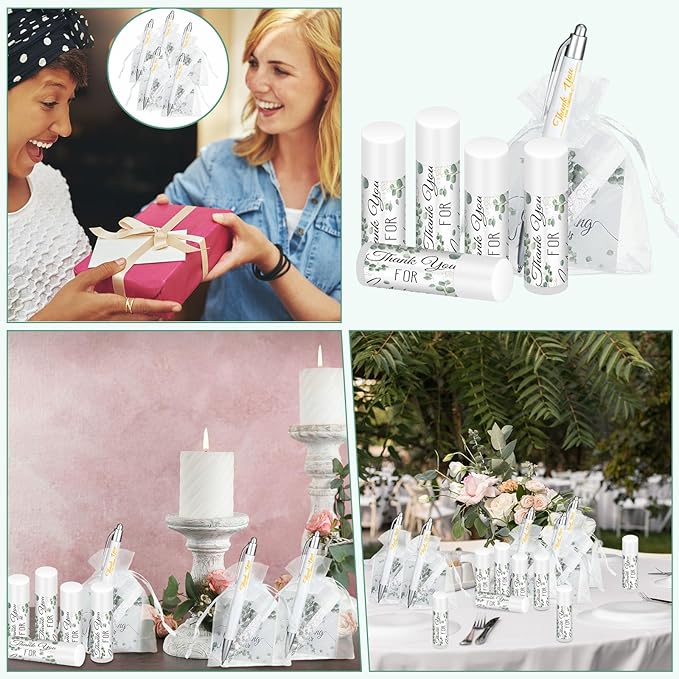 50 Set Bulk Thank You Combo Gifts Include Lip Balms Appreciation Ballpoint Pen Thank You Card Organza Drawstring Gift Bag Pouch for Wedding Parties Baby Shower Favors, Eucalyptus Leaves Style