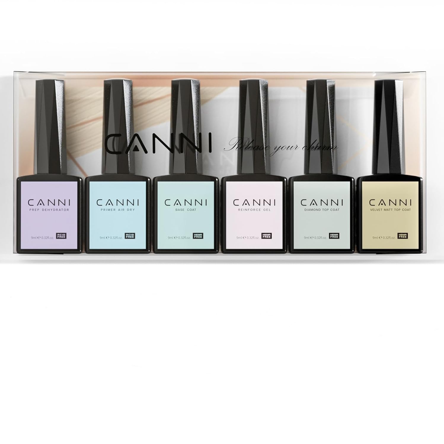 CANNI 6Pcs 9ml Hema-Free Nail Dehydrator Primer, Base Coat Reinforce Diamond Gel Top Coat and Matte Top Coat Gel Nail Polish Set, Soak Off LED Nail Gel Polish Set Nail Art Starter Manicure Salon