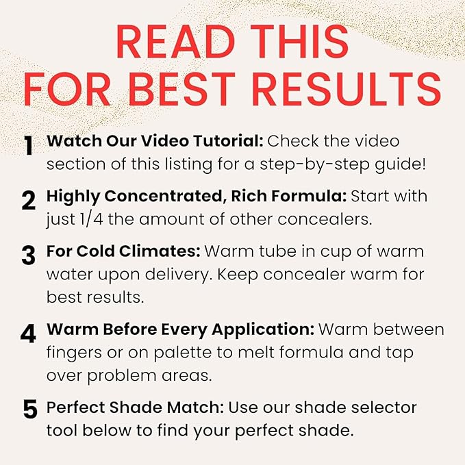 - Read This For Best Results: Use just 1/4 the amount of typical concealers; warm on fingers/palette until it melts for flawless application; find your perfect shade with our shade selector tool below; for cold climates to keep product warm before use; and check our video section for a detailed tutorial.