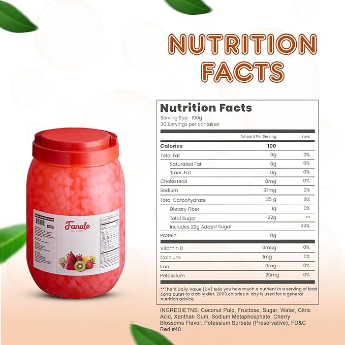 - ๐๐ฐ๐๐๐ญ ๐๐ง๐ ๐๐ฑ๐จ๐ญ๐ข๐ ๐ ๐ฅ๐๐ฏ๐จ๐ซ: Each Fanale coconut jelly boba tea variety is infused with sweet and exotic flavors that complement a range of recipes. This nata de coco jelly topping includes strawberry, lychee, blueberry, mango, sakura, green apple, coconut, Konjac, and coffee flavors, adding a distinct and delightful twist to your creations.