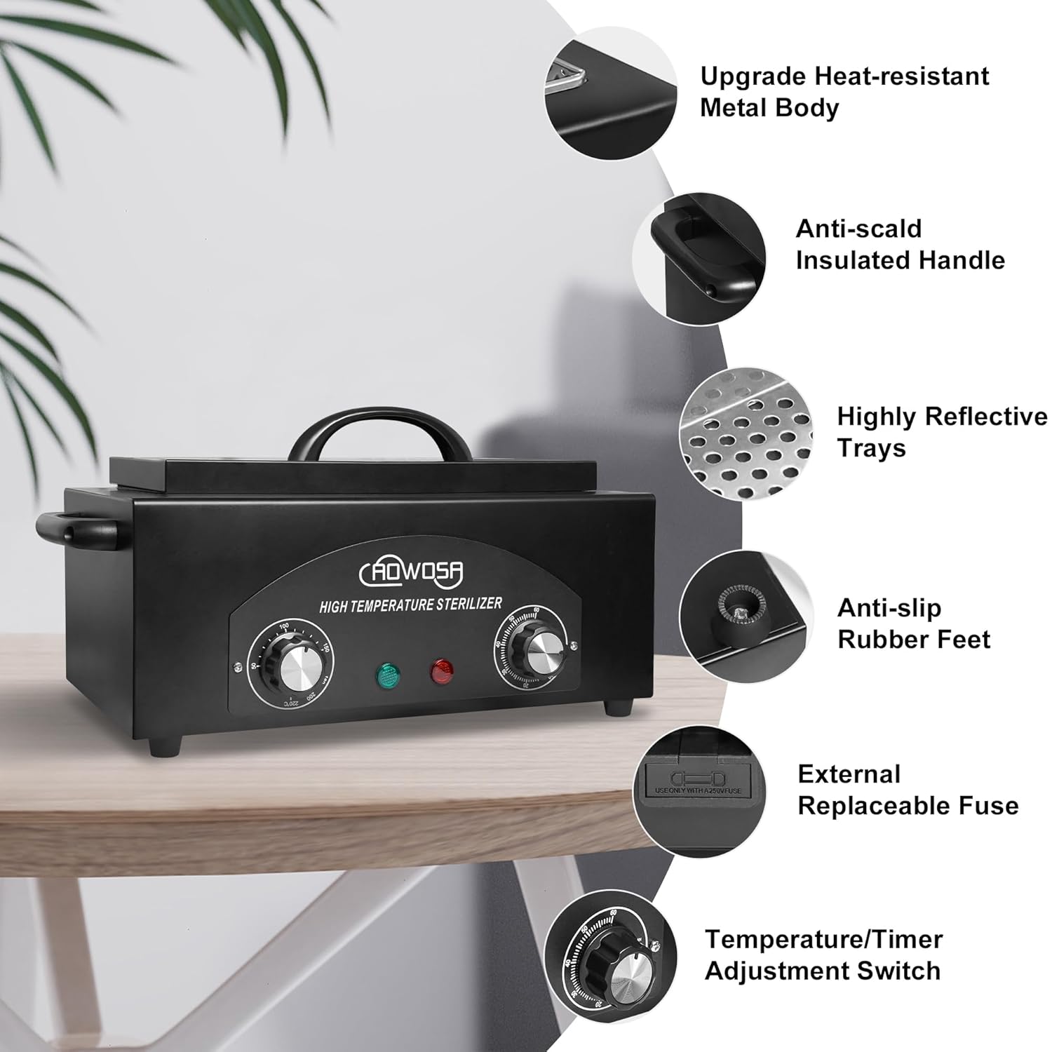 - 【Wide Application】AOWOSA dry heat cabinet can clean nail tools, tweezers, nail clippers, barber tools and other metal items, different tools can be adjusted to different temperatures and time, has achieved a better cleaning effect. Perfect for beauty salons, nail salons, barber stores, laboratories, dental clinics and home use.