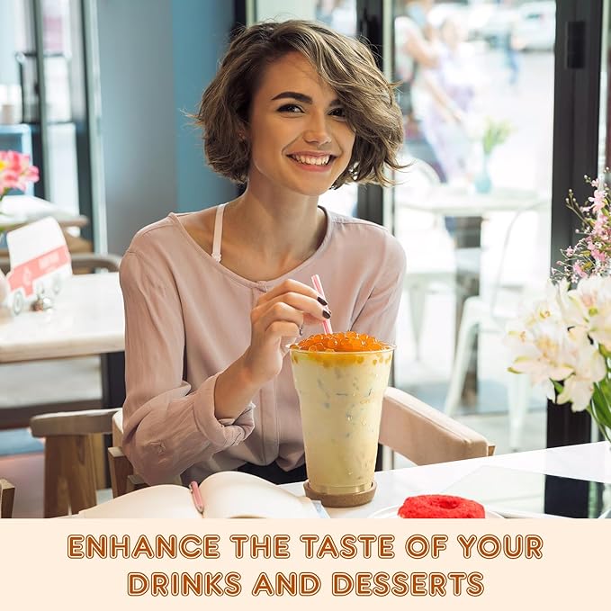 - ๐๐จ๐๐ญ ๐๐จ ๐๐ก๐๐ฐ: Each Peach Boba Pearl is coated in a clear, slightly gummy skin that adds a chewy texture. This makes it fun to eat, and when you bite into it, it bursts with a juicy filling of Peach that adds a great feel to it.
