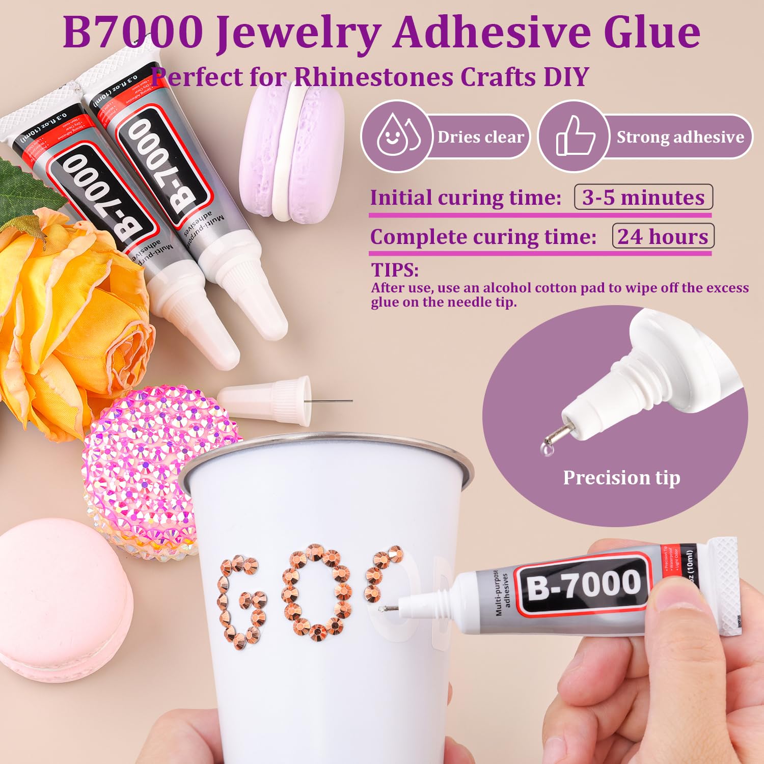 - đB7000 CLEAR GLUE FOR GEMS -- Our B7000 glue has strong adhesion and dries clear, non-toxic and harmless to the skin.The glue has a precision needle for easy application, initial cure time is 3-5 minutes and full cure time is 24 hours. The glue will have a slight overflow when first used, before use you can leave the glue head up for a few minutes to avoid overflow. After use, the needle needs to be wiped with an alcohol pad.
