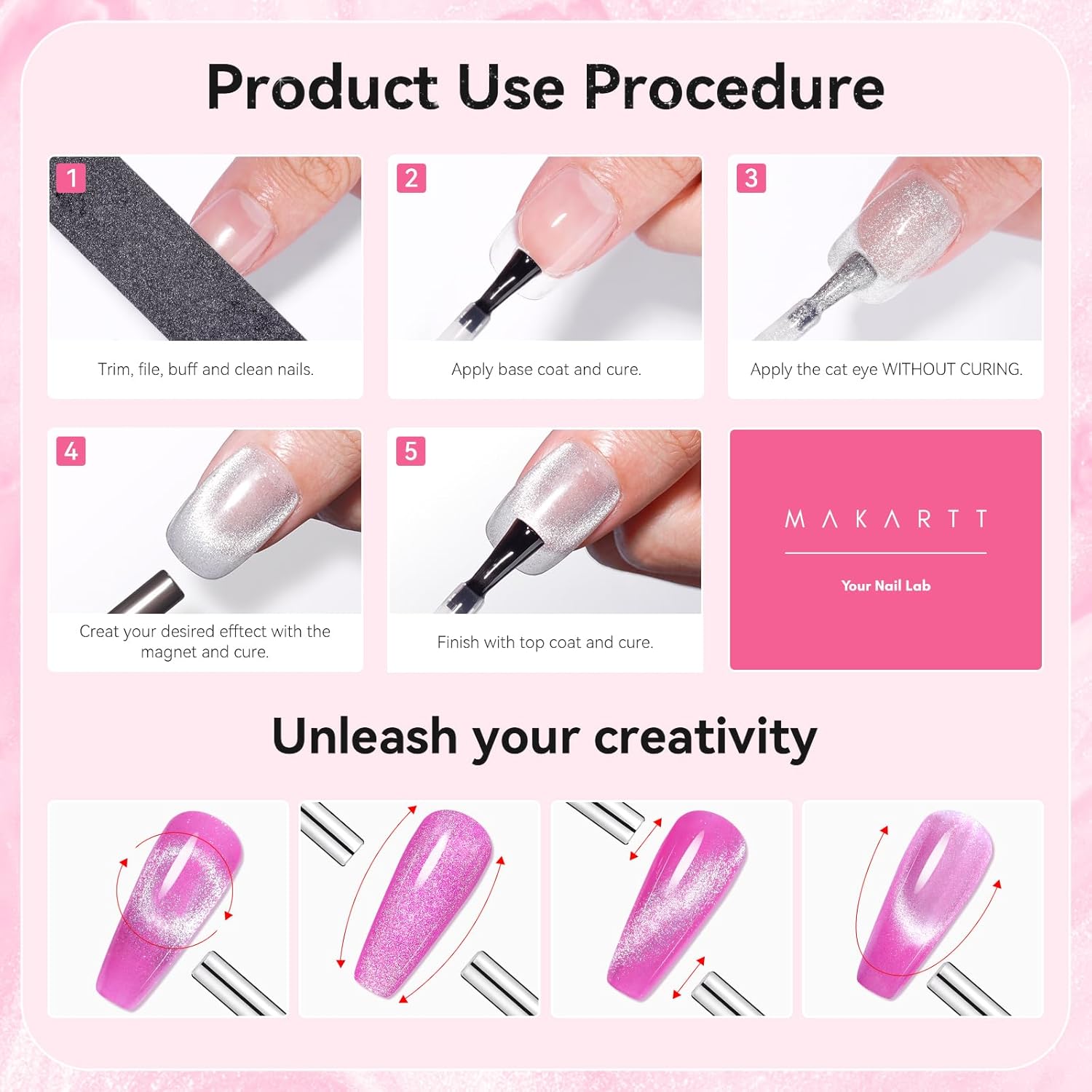 - Magnetic Cat Eye Effects: Makartt cat eye gel nail polish with magnet creates holographic effects. This 10ml silver polish shifts under different lighting. Follow tutorials for various captivating styles.
