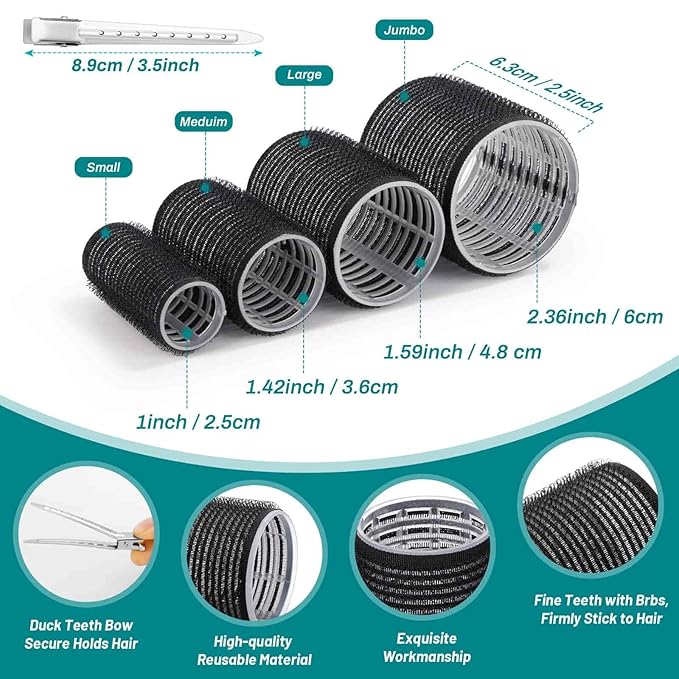 - 【4 Different Sizes】This curlers for hair set includes 4 different sizes: jumbo 2-3/8”, large 1-7/8”, medium 1-3/8”, and small 1”. Multiple sizes create any size curls, lift and volume. This hair rollers set with clips is suitable for long medium short thick hair, not recommend for relatively very fine hair