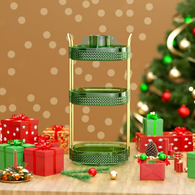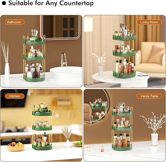 Awenia Rotating Makeup Organizer 360, Stackable Adjustable Large Capacity Cosmetic Storage Unit,Dresser Bathroom Kitchen Countertop Organizer with Metal Handle, Plus Size (Gem Green, 3 Tier)