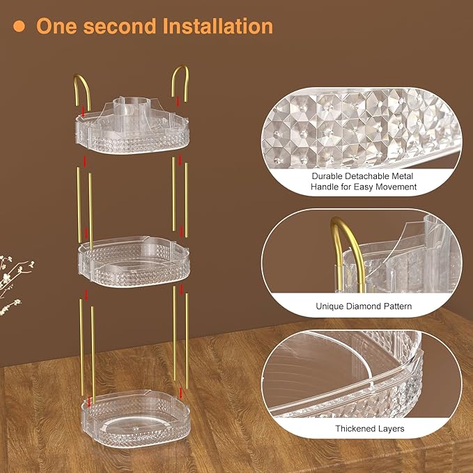 - 360 Degree Rotation& Easy to Install:➤Reinforced steady base rotates smoothly and silently, the rotating makeup organizer is easy access to all of your make-up in seconds.Less installation step are required other than inserting metal rack and handle,do not worry about repeated disassembly to shorten the lifetime of the makeup organizer.