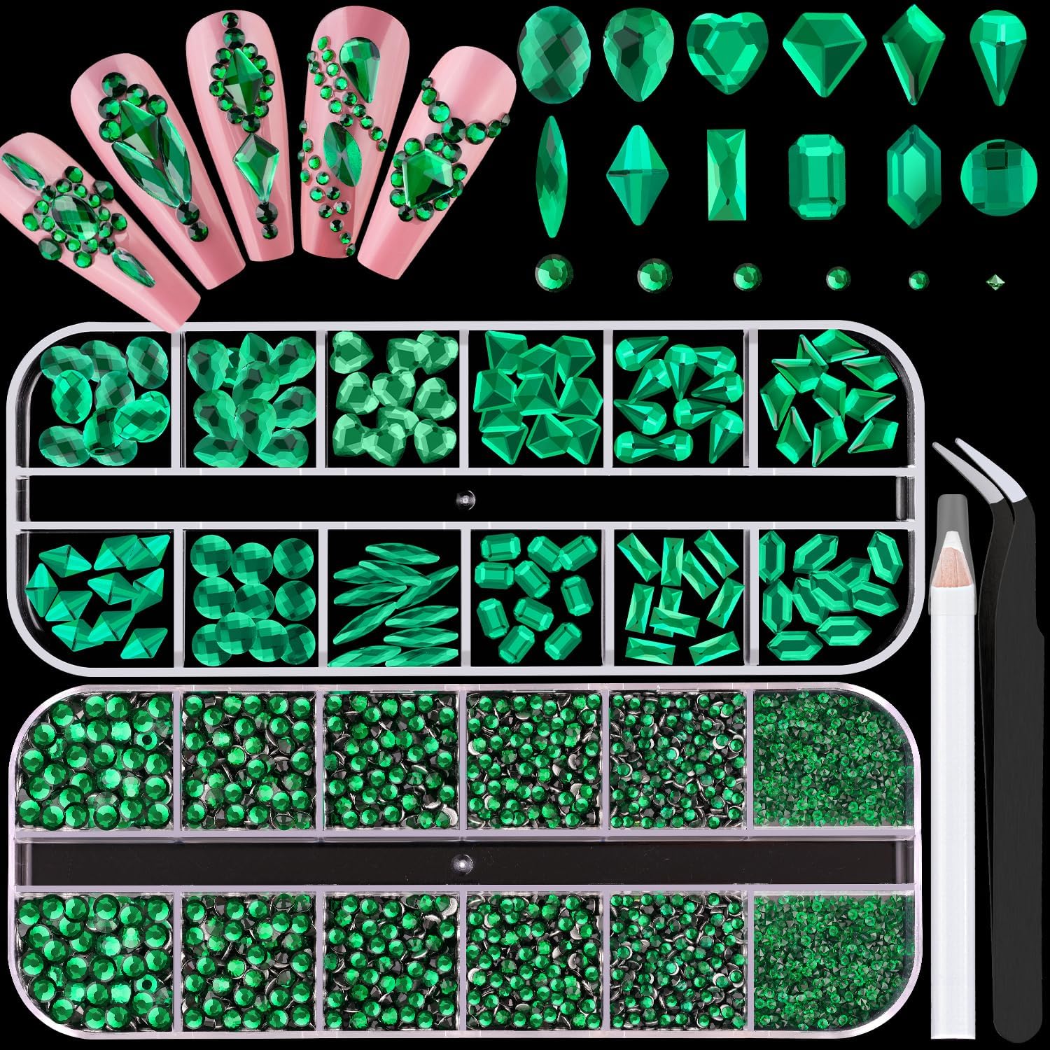 - šPACKAGE CONTENT -- The package contains 120Pcs multi shapes flatback gems crystal and 2510Pcs 1.5-4mm round beads, totally 2630Pcs Emerald Green rhinestones. Additionally, 1 tweezers for large size gems and 1 pickup pen for small size gems. This rhinestones kit makes it easy for you to make any nail art you like, and will bedazzle your acrylic nails!