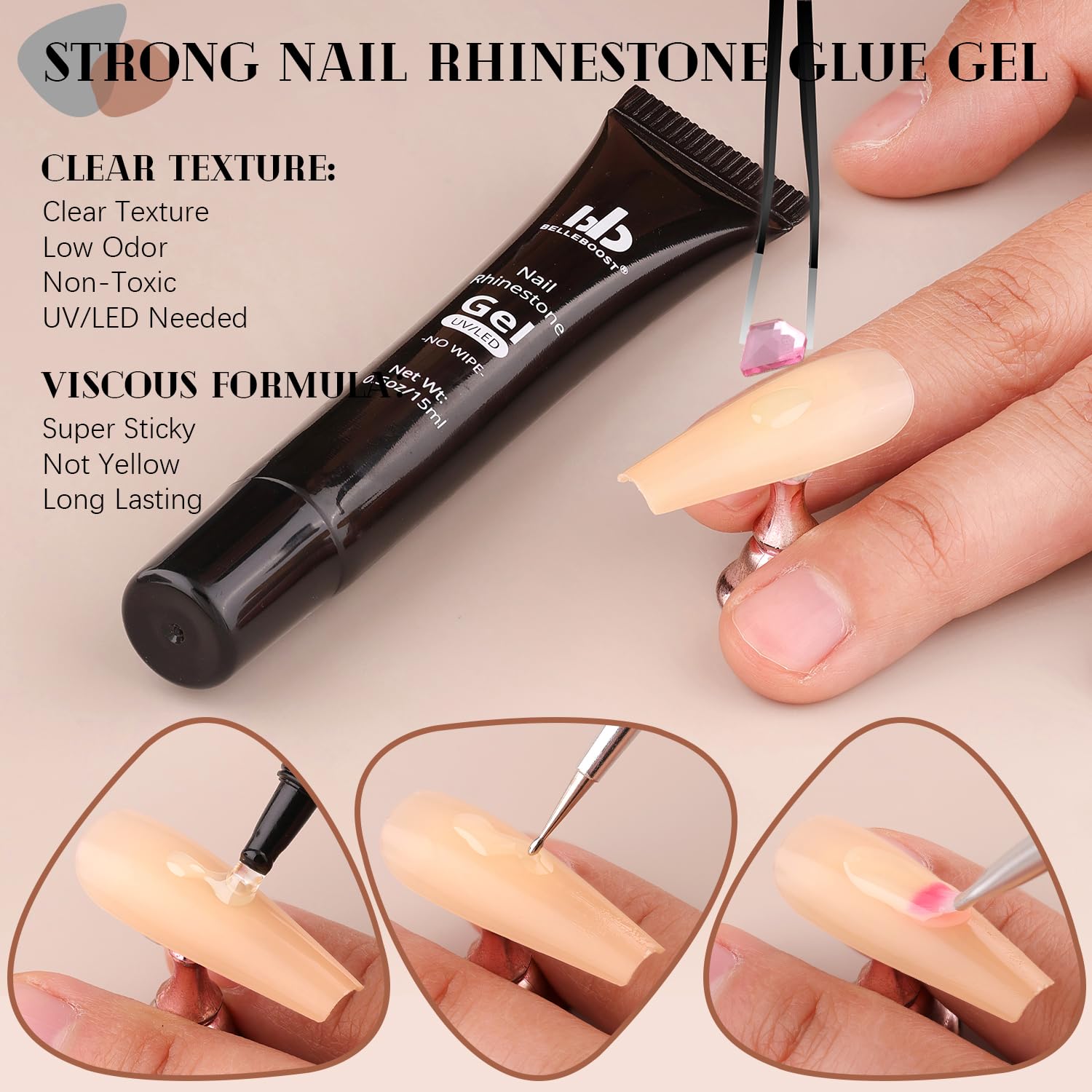 - šADHESIVE GEL GLUE: The rhinestones glue gel uses a special, non-toxic and eco-friendly formula with strong tackiness, adhesion, and fluidity for easily applying decorations. It is a type of UV gel glue. After proper curing under a UV/LED lamp, the glue dries clear with superior bonding strength that can last a few weeks without falling off. With the designed tip, you can easily and conveniently apply the glue to the nail bed or the surface of false nails.