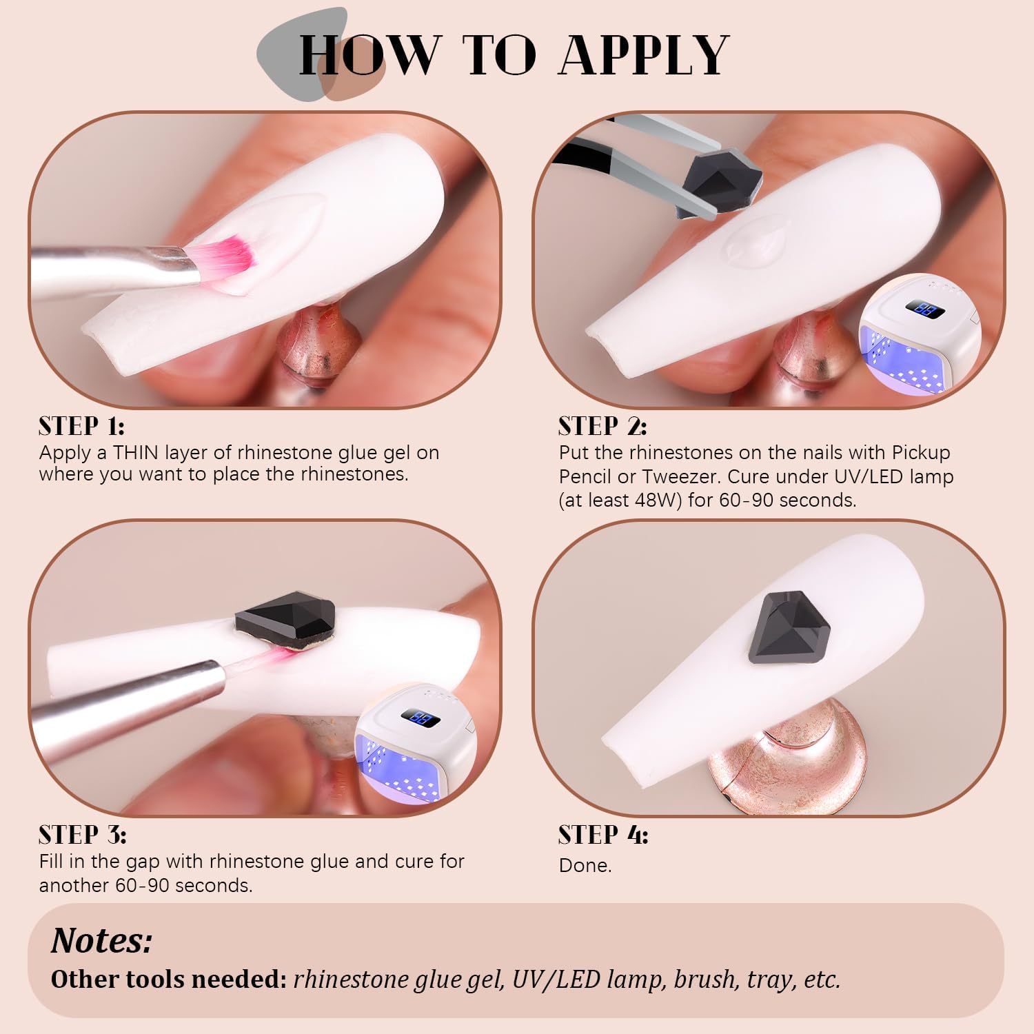 - šEASY TO USE -- Easy to apply on artificial nails. After applying nail polish and applying enough gel on the nails, simply use the equipped tools (pickup pen + tweezers) to pick up the crystals onto your nails to create your fabulous DIY designs! These crystals gemstones are different from those hotfix stones, they are not self-adhesive, you have to apply glue to stick them (glue is not included.)
