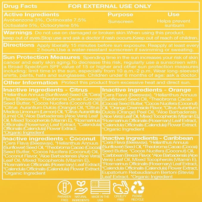 - SPF 15 Sunscreen Lip Balm - SPF 15 Tropical Variety Pack includes Caribbean, Citrus, Coconut, and Orange flavors, each crafted for protection and hydration. Infused with the essence of tropical fruits, Aloe, and Vitamin E, these balms offer soothing care and moisturizing benefits with organic ingredients and natural beeswax. Perfect for daily use, this pack turns your lip care routine into a tropical getaway. Ideal for lip care, lip sunscreen, and daily hydration.