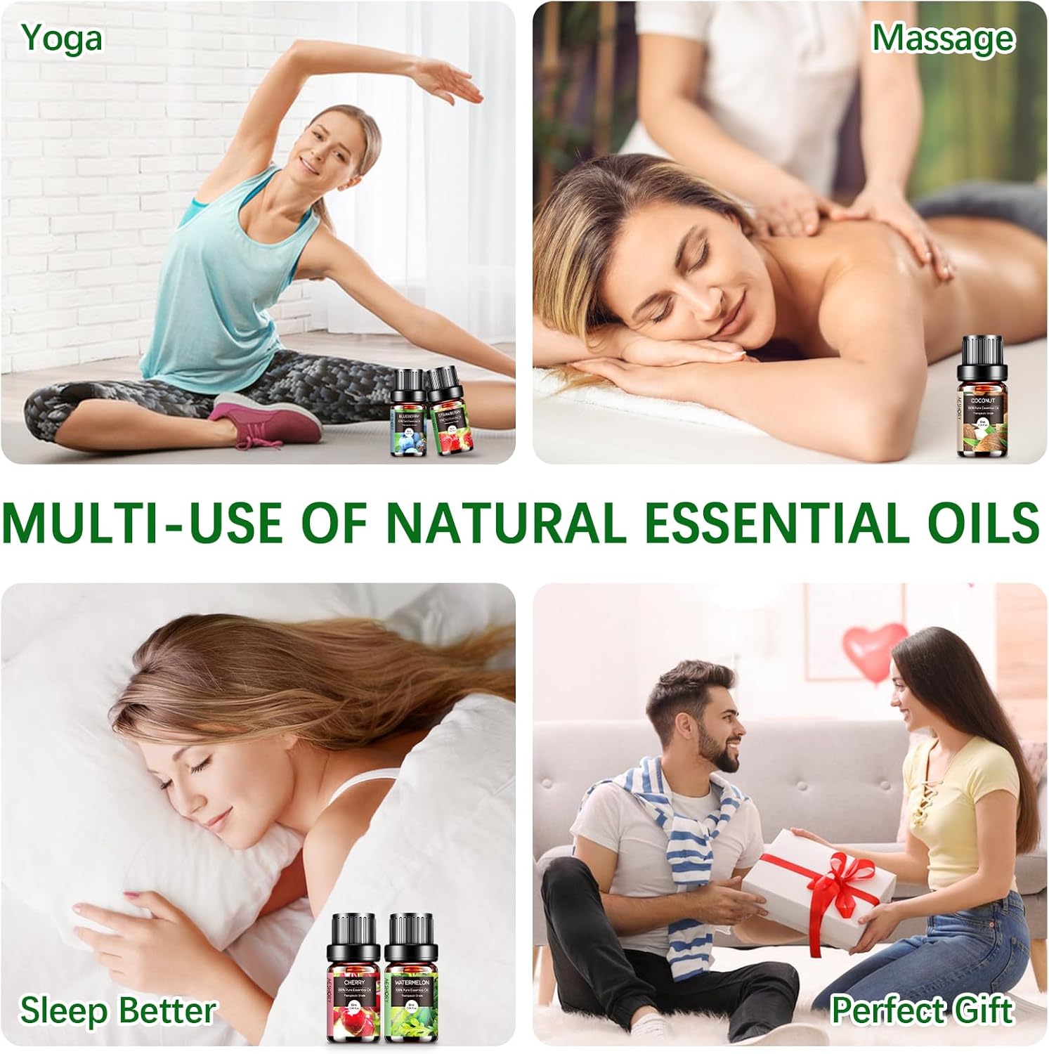 - 🥥【Multiple Uses】These essential oils can be used for aromatherapy, diffuser, massage, skin & hair care. Simply add a few drops to any diffuser and fill your entire room with that aroma, suitable for home care (large room, bedroom, living room, bathroom), office, outdoors, campground, yoga room and spa for a whole day relaxation.