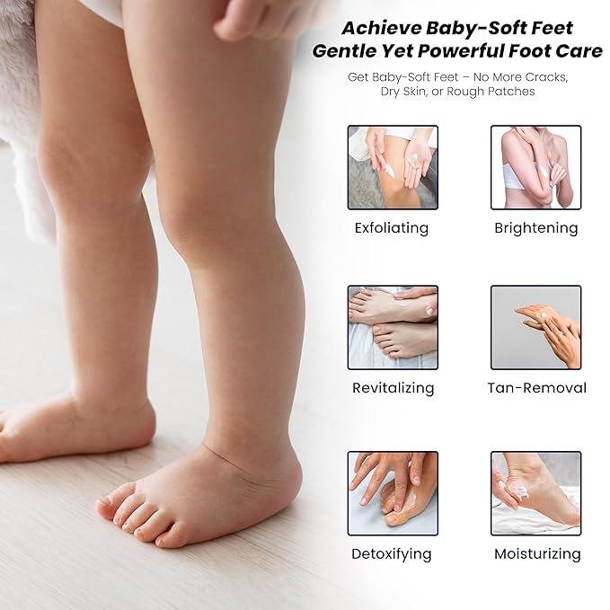 - CRACKED HEEL CARE & SMOOTHING TREATMENT – Transform rough, dry feet with our revitalizing foot scrub. Infused with exfoliating pumice stone, it gently buffs away dead skin, helping to soften calluses and improve the look of cracked heels. Enriched with nourishing ingredients, it leaves feet feeling refreshed, smooth, and spa-soft with every use. Perfect for regular maintenance and at-home pedicures.