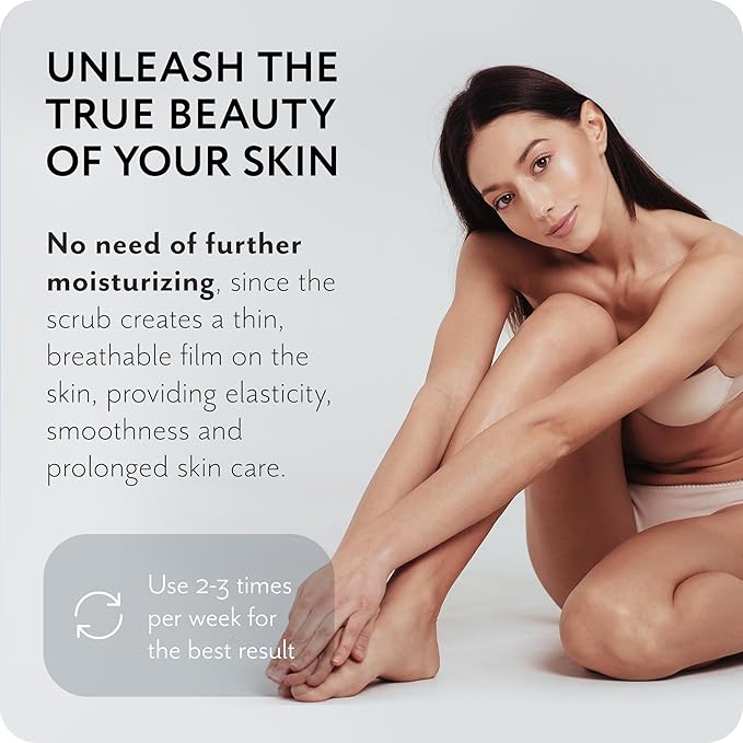 - 🥥 Powerful Plant-Based Oil Complex: Body scrubs for women contains valuable oils like coconut, sweet almond, avocado, and shea butter. Coconut oil nourishes the skin, retains moisture, and accelerates cell regeneration. Sweet almond oil deeply moisturizes and restores the lipid barrier. Avocado oil reduces inflammation, while shea butter enhances skin firmness and elasticity, slowing down the aging process.