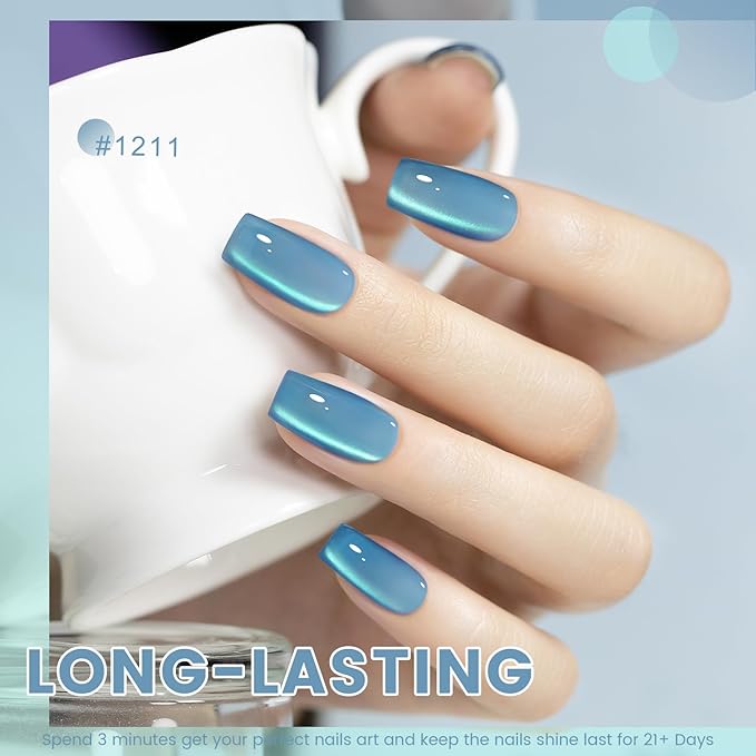 - EASY TO USE:This cateyes gel polish is made with with natural resin ingredients,magnetic shimmers and a smooth formula,so this gel polish set won't cause smudges cracks,or chips.It can last for 21+ days with perfect shine under proper application