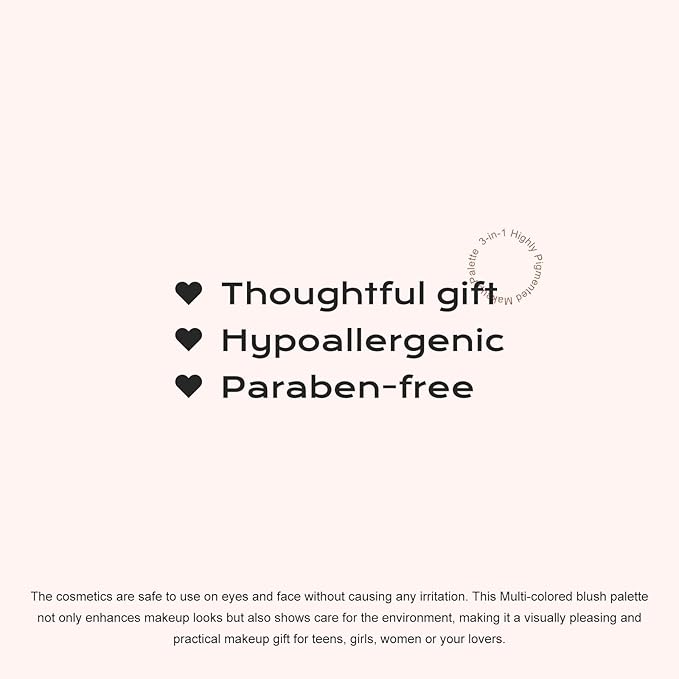 - 3-IN-1 Makeup Palette -- This trio is a stacked, comes with a Blush, Contour and Highlighter in a bite-sized palette.Multi-colored makeup palette is a perfect blend of daily complimentary hues Also as contour to accentuate & enhance cheekbones for a fresh, healthy natural-looking flush.