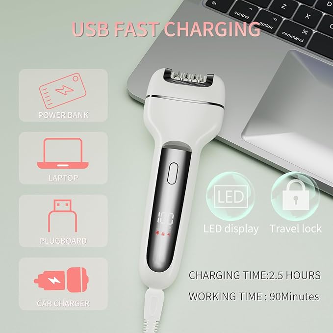 - Women Epilator Care Kit (1 epilator head, 1 shaver head and 1 callus remover head - Remover 3 in 1) Rechargeable, LED Battrey Capacity Display, travel lock function, You can remove hair and calluses as needed by simply replacing the head caps.