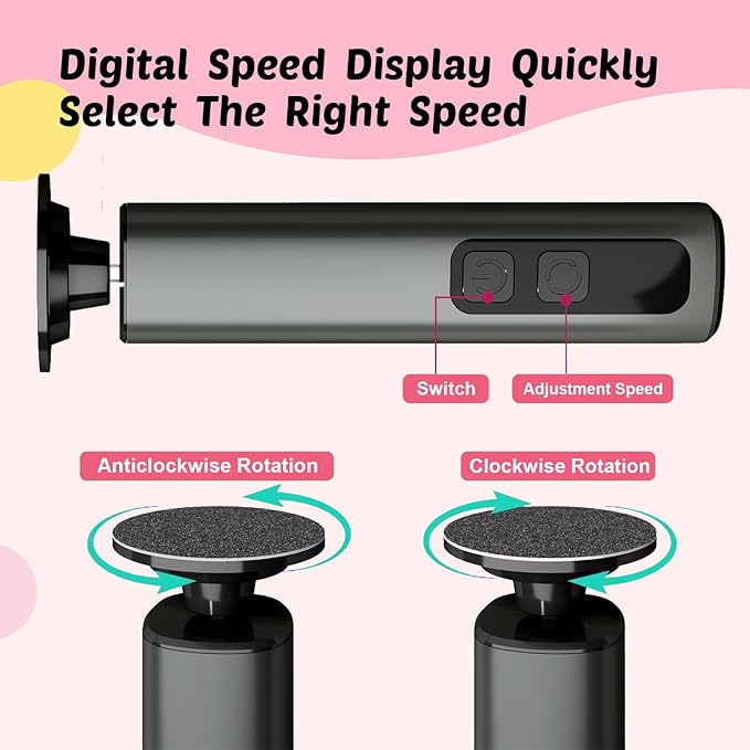 - 【9-Speed Adjustable】Speeds 1-3 for sensitive skin, 4-6 for daily exfoliation, and 7-9 for stubborn calluses. Features a 2-second hold-to-start function for safe operation