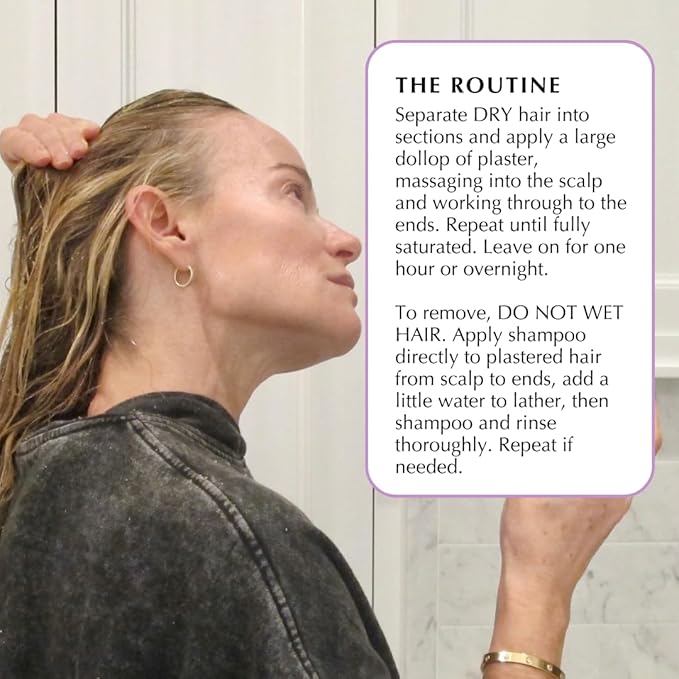 - The Routine: Start with dry hair, separated into small sections. Scoop out a large dollop of plaster, and gently massage it into your scalp, to the ends of each strand. Depending on your hair’s nutritional needs, leave in place from 1 hour to overnight. To remove, do not get hair wet. Apply a generous amount of shampoo directly onto plastered hair and wash as usual. Follow up with conditioner if desired. Keep in refrigerator & use within 3 months