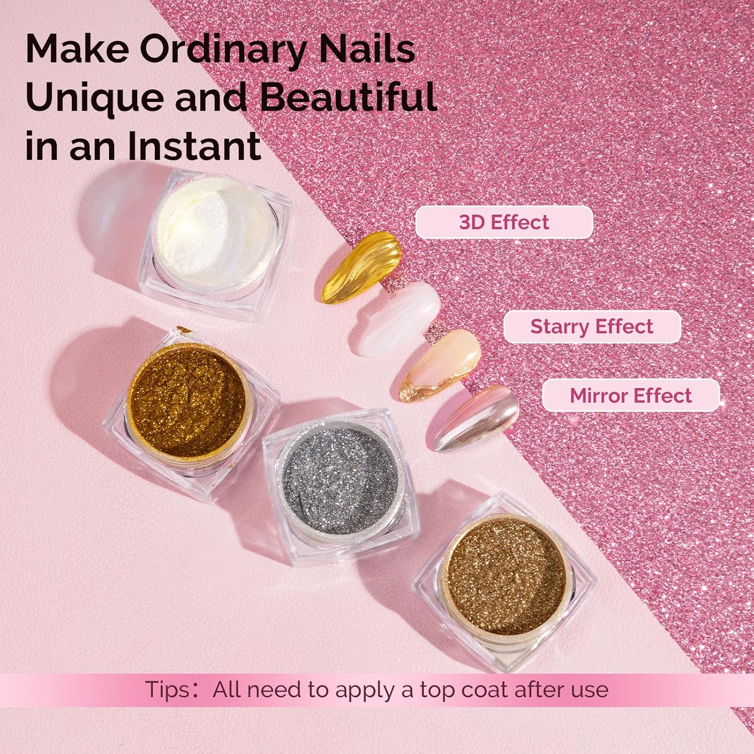 - Wide Range of Applications: Suitable for UV gel nails, acrylic nails,natural nails or false nails.Easy to get a salon grade chrome effect without special techniques.Powder is easy to apply and suitable for beginners