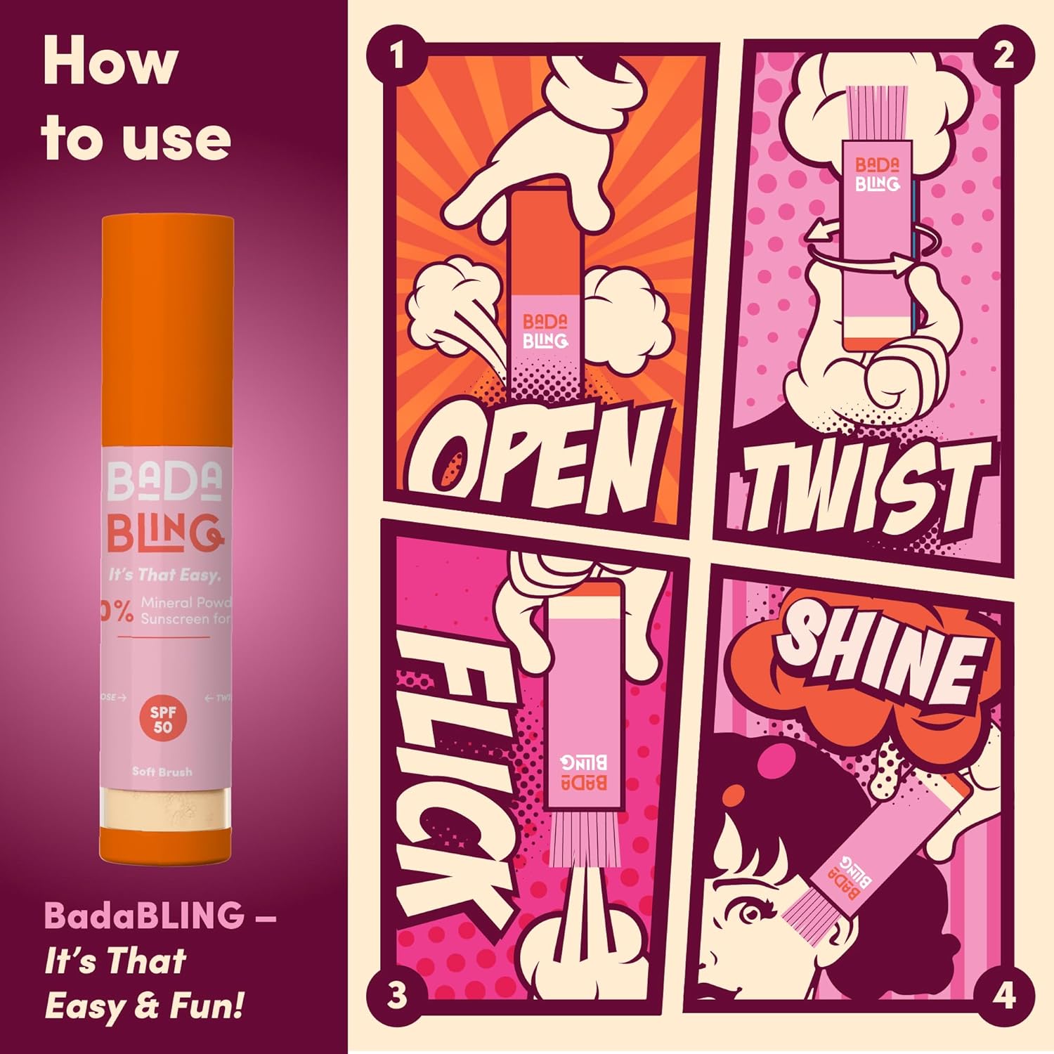 - Lots of Fun! - Bada Boom Mineral Powder Sunblock is a fun way to apply sunscreen, no tears, no mess, and feels good!